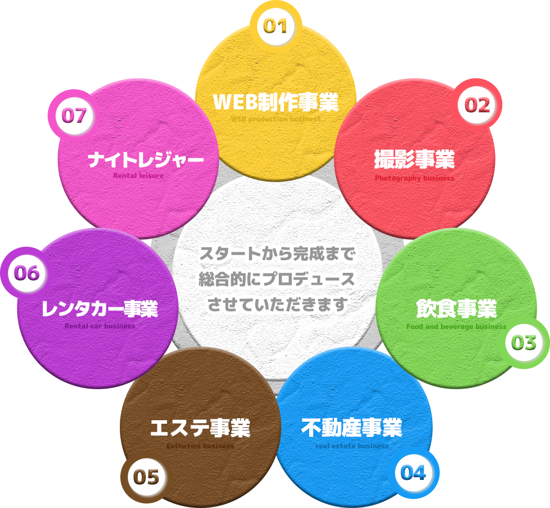 『制作事業』『ナイトレジャー運営・コンサル』『飲食事業』『不動産事業』『撮影事業』『マーケティング事業』